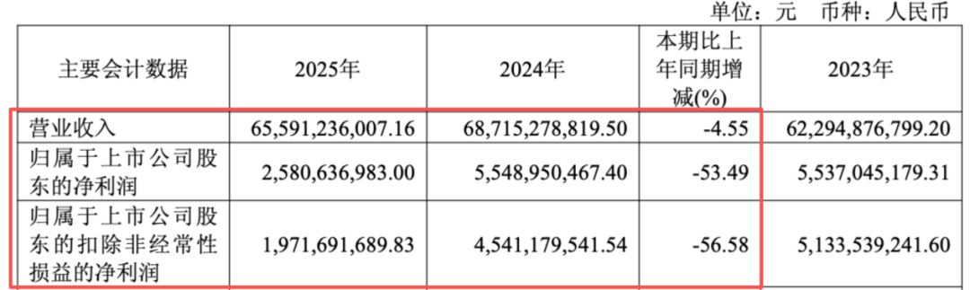 而这还是“极限让利”之后的结果。2025年,公司实现归母净利润25.81亿元,同比下滑53.49%,创下自2019年A股上市以来的利润最大跌幅。