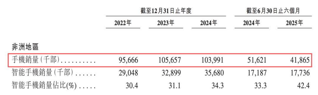 招股书显示,2024年,传音在非洲地区销售了1.04亿台手机,市占率高达61.5%。但在2025年上半年,其销售了4186.5万台手机,较2024年同期的5162.1万台骤减近1000万台手机,跌幅达到19%。
