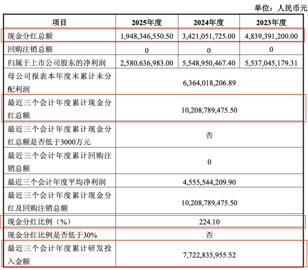 将时间拉长来看,在2023年至2025年的短短三年时间里,传音的现金分红合计高达102.09亿元,现金分红比例为224.10%。在这3年里,公司的研发投入总和不过才77亿元。