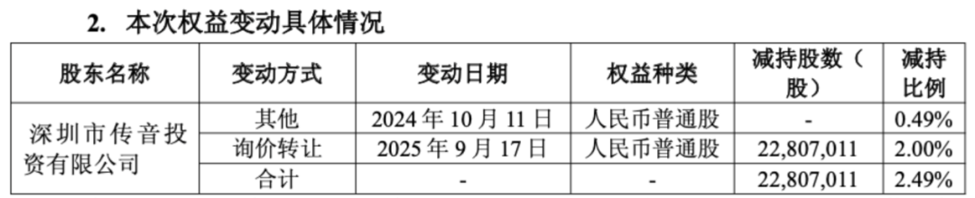 2025年9月,传音投资通过询价方式转让2280.70万股公司股份,对应比例为2%,转让价格为81.81元/股,套现18.66亿元,受让方包括私募、基金管理公司、保险、证券以及境外投资机构J.P. MorganSecurities plc(摩根)等共20家机构。